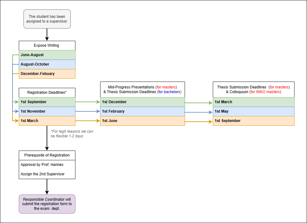 We consider the following thesis procedure, from exposé writing and registration to mid-progress presentations and final submission.